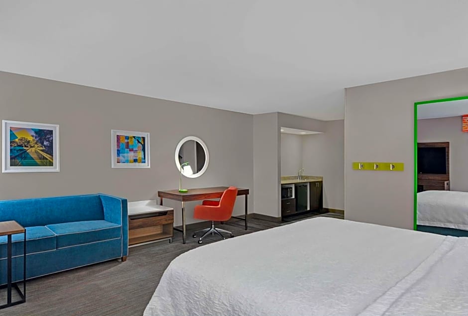 Sofa bed, desk, ergonomic chair, microwave, mini-refrigerator, free WiFi, 32-inch LCD HDTV. Enjoy your stay in this spacious guest room, featuring a comfortable king-sized bed and sofa bed. Surf the web with our free WiFi access, or use it to get some work done in comfort at the large desk with ergonomic chair. Stretch out on the sofa and watch premium HD channels or on-demand movies on the 32-inch flat-screen HDTV. Prepare a snack in the small kitchen area, equipped with a microwave and mini-refrigerator. Settle down for the night in the clean and fresh Hampton bed®. Other amenities in this room include weekday newspaper delivery, bath products, fluffy towels, and a coffee machine.